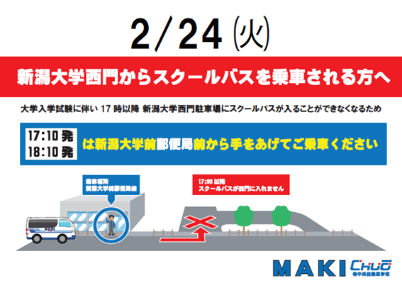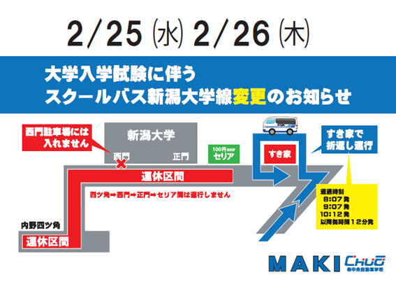 大学入学試験に伴いスクールバス新潟大学方面を下記のとおり変更いたします。