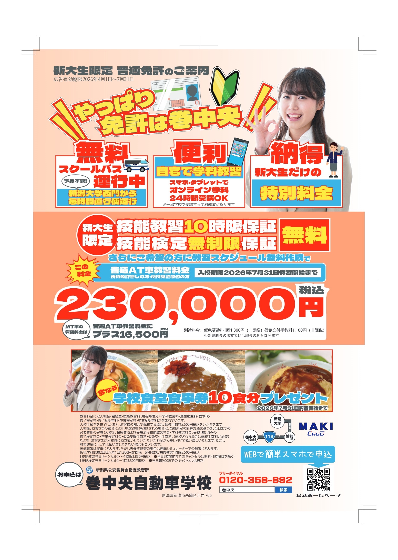 新潟市西蒲区で運転免許を取得するなら巻中央自動車学校!新潟で格安な免許合宿をお探しの県外の方には、女性専用自炊プランがオススメ。短期集中!スピーディに免許取得を目指す合宿コース。新潟県内の方には、日時を選んで自分のペースで学べる通学コースをご用意しております。無料送迎バスもございます。